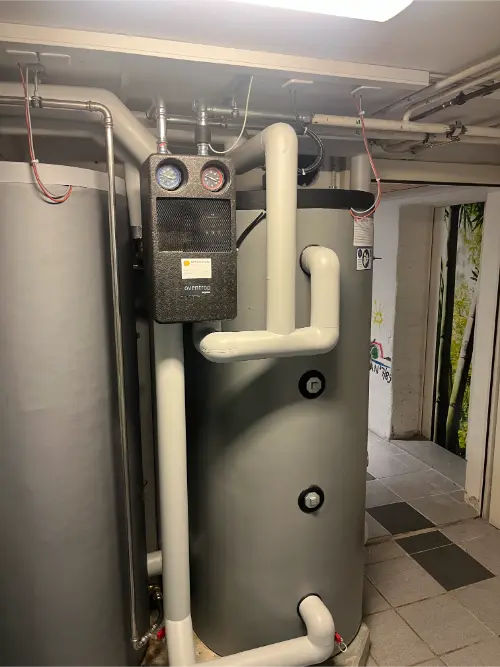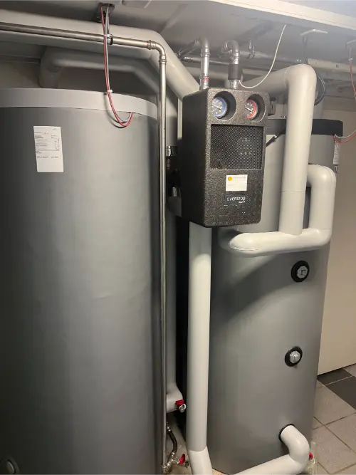 Die Erdsonden-Wärmepumpe ist sehr effizient. Sie nutzt die in der Erde gespeicherte Wärme als Energiequelle. Das Wasser im geschlossenen Kreislauf wird in einen Wärmetauscher geleitet, wo die Wärme an das Heizungs- oder Kühlsystem abgegeben wird. Anschliessend wird die abgekühlte Flüssigkeit zurück in den Erdkollektor geleitet, wo sie erneut Wärme aus dem Boden aufnimmt.